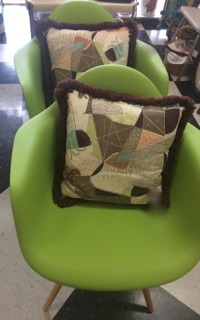 Great mid-century design can be found in this pair of chairs with contrasting pillows! Available from Dealer #57.