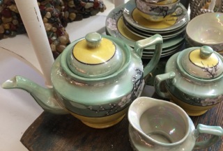 Dealer #109 serves up tea in a soft color palette with iridescent glaze.