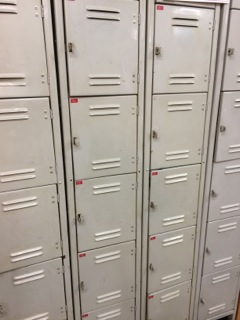 Dealer #4 lines up tall lockers with six compartments for storing small items.