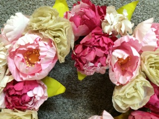 Red peony stems are pushing through the soil while a silk wreath of peonies from Dealer #56 allows us to enjoy the flower year round.
