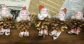 Dealer # 100 has this set of pinecone Santas ready for the slopes. Recycling from the 1960's.
