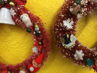 A colorful wall sets off two vintage wreaths filled with bells, bears, Santa, elves and more. Available from Dealer #8.